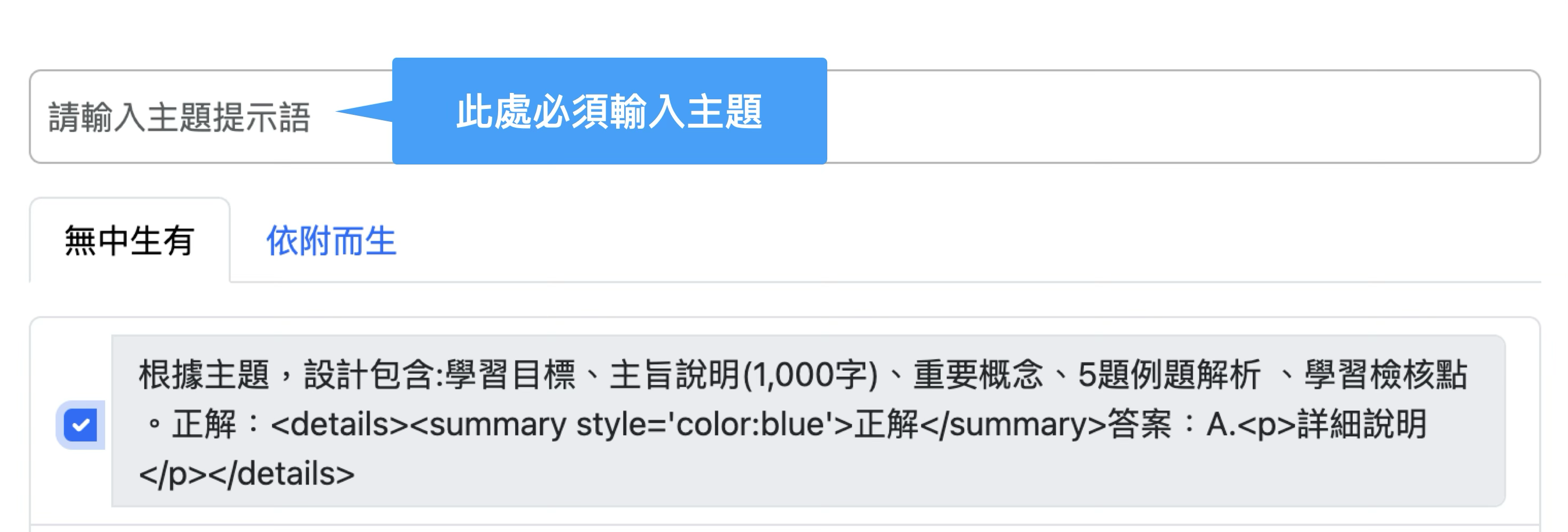 「無中生有」的 prompt,指的是:只需輸入主題(例:〈師說〉)並搭配一段範例指令(例:「根據主題,設計包含:學習目標、主旨說明〔約1,000字〕、重要概念、5題例題解析、學習檢核點」),將兩者組合後貼入 AI,即可直接生成完整內容的使用方式。