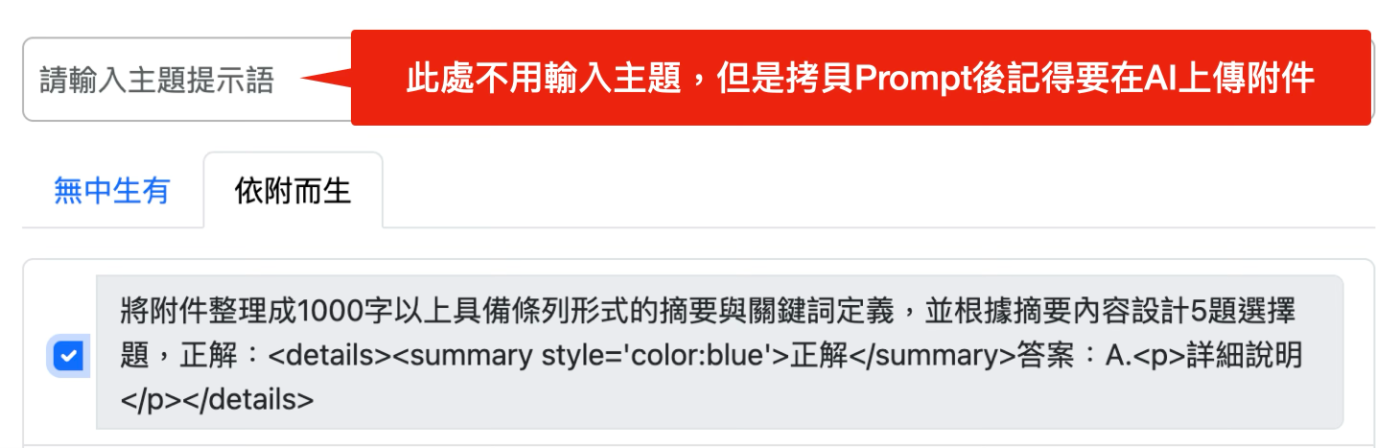 「依附而生」的 prompt,指的是:先勾選拷貝一段範例指令(如:「根據附件,設計包含:學習目標、主旨說明〔約1,000字〕、重要概念、5題例題解析、學習檢核點」)。然後開啟AI在輸入框上傳附件(例:影音字幕、文件、圖片)+再將拷貝的範例指令貼入 AI,AI便會以附件內容為主要依據,直接生成完整成果的使用方式。常用於:生成附件的摘要、利用AI協助進行作品的評閱等