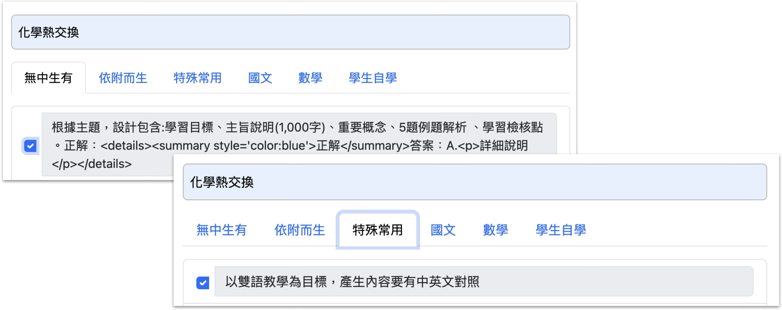 例如:(1) 先勾選一段無中生有範例指令(如:「根據主題,設計包含:學習目標、主旨說明、重要概念、5題例題解析、學習檢核點」)。(2) 另外勾選特殊常用的指令:(如:生成文字會有中英文對照)。 然後點選拷貝內容,就可將(1)&(2)的指令內容一起拷貝,然後將上述拷貝的指令貼入 AI,AI便會以混合的指令為主要依據生成完整成果。 常用於:雙語教學教材製作