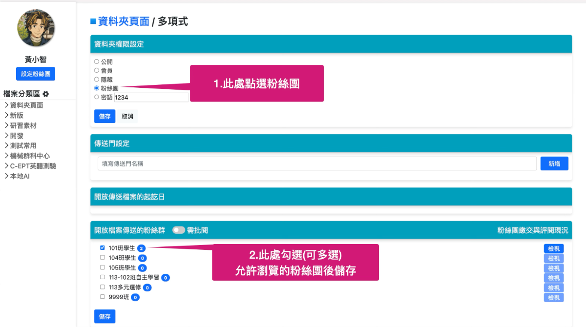 雖然在資料夾編輯時有設定瀏覽權限為『限粉絲團』,但是下方的粉絲團也必須勾選,這樣系統才能確定允許哪幾個粉絲團的成員可以進入資料夾瀏覽內容。