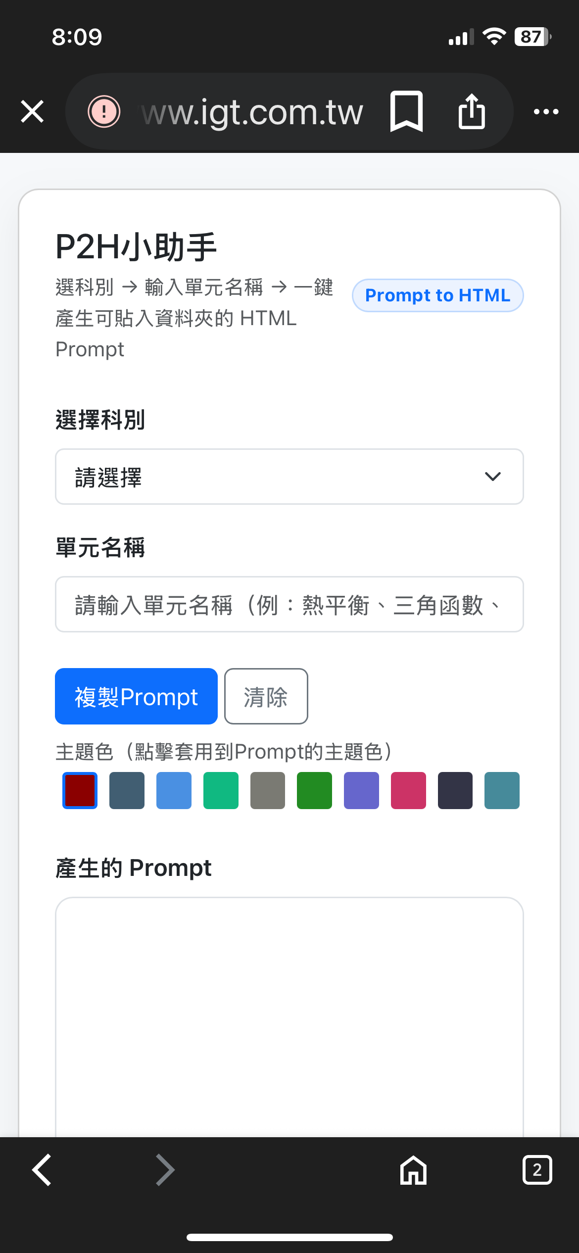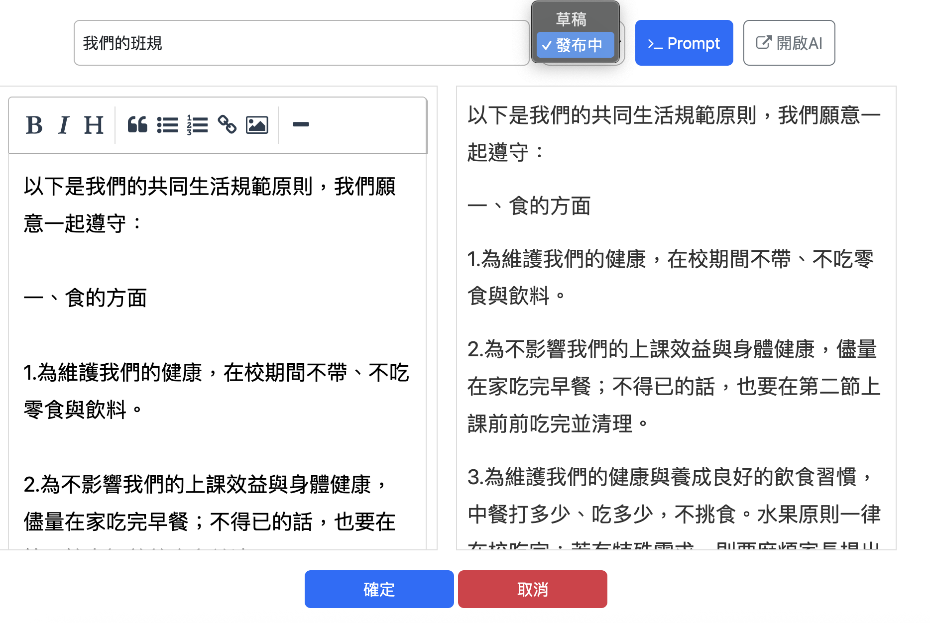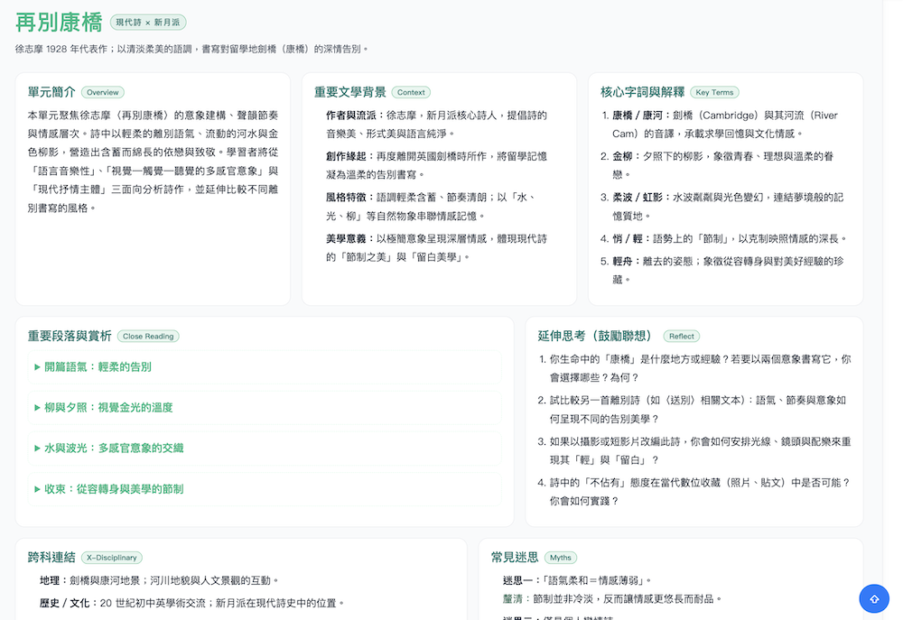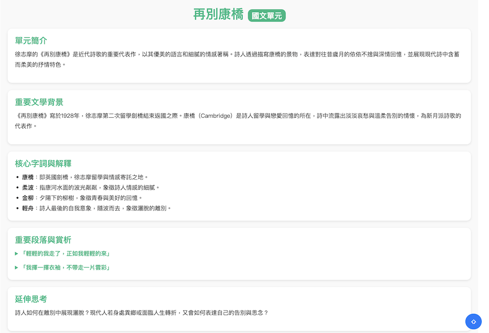 | 1.節省備課時間 ► 老師不用從零開始編寫單元導讀,AI 會自動根據提示生成結構化的 HTML 頁面(含單元簡介、核心概念、延伸連結、常見迷思等)。 ► 減少重複製作教材的時間,可以專注在課堂互動與學生學習狀態的觀察。 2.教材品質一致化 ► 不同老師輸入相似的提示,系統生成的導讀會保持基本結構一致,讓全校的教材更標準化。 ► 方便學校行政端進行課程成果歸檔與檢視。 |